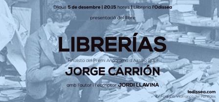 Jorge Carrión serà a la llibreria l'Odissea per parlar de l’assaig que li ha valgut quedar finalista del premi Anagrama d’Assaig 2013: Librerías, un interessantíssim recorregut personal per les llibreries més singulars del món. Un llibre sobre llibreries que es converteix des de la primera pàgina en un homenatge a aquests establiments de cultura (i a la literatura, als escriptors i als llibres) i en un llibre de viatges pels racons llibrescos més curiosos del planeta.