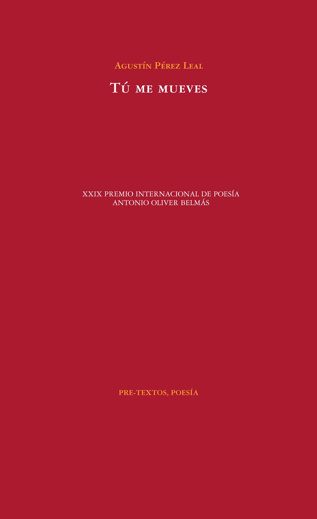 Agustín Pérez Leal nació en Teruel en 1965 y reside en Petrer (Alicante). Ha publicado los libros de poemas Cuarto Cuaderno o Libro de Siberia (Pre-Textos, 2001) y La Noche en Arras (Pre-Textos, 2006), y la plaquette ?En la tumba de Orfeo? (Comunidad Budista Soto Zen Luz Serena, 2014). Colabora regularmente con reseñas críticas en la revista Turia, de Teruel. Tú me mueves es su tercer libro de poemas.