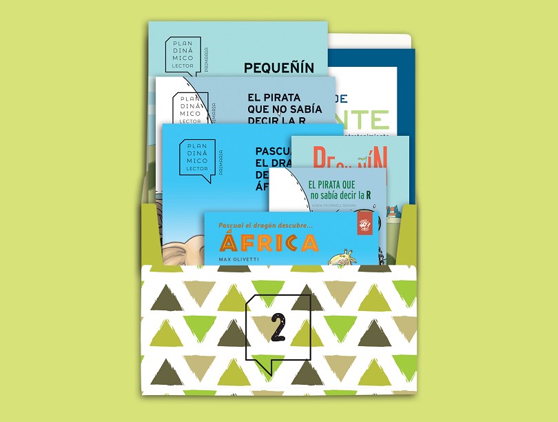 · 3 libros: “Pascual el dragón descubre África”, “El pirata que no sabía decir la r” y “Pequeñín”. Se incrementa gradualmente el nivel de dificultad lectora de los libros y permite una adaptación gradual de las primeras lecturas ilustradas con gran formato y a color, a los libros de lectura con más texto.